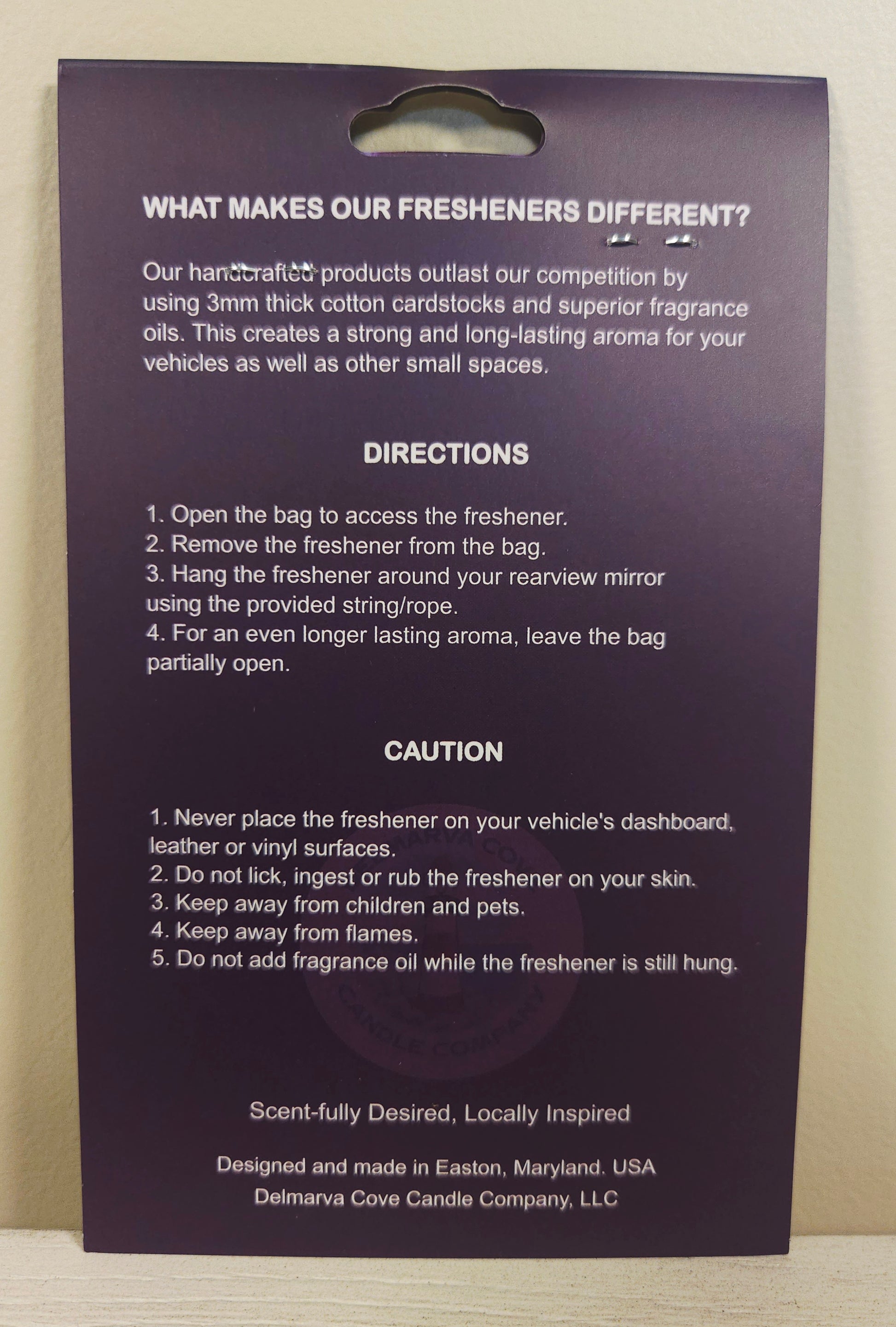 I have never been one to buy scents for my car, however my wife complained that my car smelled. I decided to purchase a car scent from Delmarva Cove.. I bought black cherry and it smelled amazing. My wife even liked it , which made it that much better.